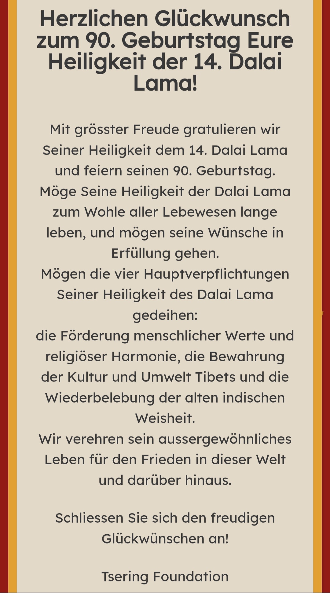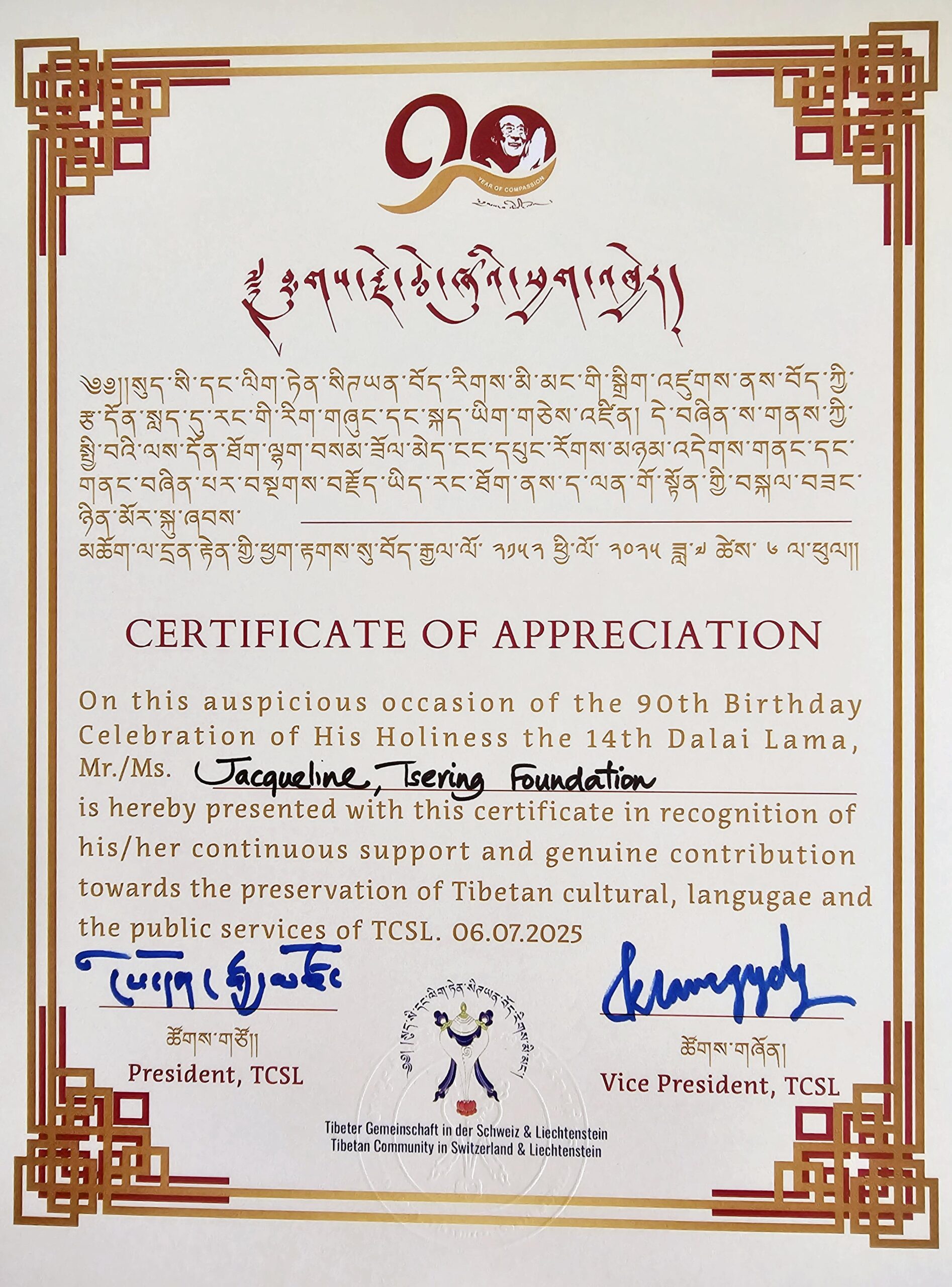 News Schweiz Unterstützung des 16. Tibet Film Festivals 2025, Zürich, September 2025.Verteilung der 3000 gesponserten Bücher an alle tibetischen Schulen der Schweiz, Turbenthal, September 2025.Publikation des Artikels «Sein spirituelles Wesen ist einzigartig!», in 100+ Schweizer Regionalzeitungen, August 2025.Tibeter Gemeinschaft in der Schweiz & Liechtenstein (TGSL), jährliche Puja vor der Stupa, Säntis, Schweiz, August 2025.Unterstützung des Tibet-Fests am Lindenberg, die Tibetische Gemeinschaft Basel hat zum Sommerfest und zur Feier des 90. Geburtstags von S.H. 14. Dalai Lama eingeladen, Basel, August 2025.Tsechen Assoziation der Schweiz und Liechtenstein, Unterstützung des Besuchs von Seiner Heiligkeit dem 42. Sakya Trizin Ratna Vajra Rinpoche, Stadthalle Bülach, Schweiz, Juli 2025.Buchpräsentation anlässlich des 90. Geburtstags Seiner Heiligkeit 14. Dalai Lama (TGSL), in Zusammenarbeit mit der Central Tibetan Administration (Department of Education), Messe Luzern, Schweiz, 6. Juli 2025.Unterstützung der Feierlichkeiten zum 90. Geburtstag von Seiner Heiligkeit 14. Dalai Lama, organisiert von der Tibeter Gemeinschaft Schweiz & Liechtenstein, Messe Luzern, Schweiz, 5. und 6. Juli 2025.Tsering Foundation gratuliert Seiner Heiligkeit 14. Dalai Lama zum 90. Geburtstag, mit Zeitungsinseraten im 20 Minuten, NZZ am Sonntag sowie im Schweizer Kombi (100+ Regional Zeitungen), Print und Online, 6. Juli 2025.Schweizer Kagyu Lhaksam Verein und Ngagyur Nyingma Verein, Unterstützung der Kagyu- und Nyingma Weltfriedensgebete, Rikon, Schweiz, Juni 2025.Willkommen in der Schweiz, Shenpenn Khymsar und Filmteam von „4 Rivers 6 Ranges“. Unterstützung der Premiere im Kino Corso, Zürich, Schweiz, Juni 2025.Unterstützung der Maha Guru Bumtsok Puja, Samstagern, Schweiz, Mai 2025.Unterstützung des Tibetzüri SC Galakonzerts, Wädenswil, Schweiz, Mai 2025.Unterstützung der 56. Generalversammlung des Tibetischen Jugendvereins, Einsiedeln, Schweiz, April 2025.Dankesschreiben der Tibeter Gemeinschaft in der Schweiz & Liechtenstein (TGSL), an die Tsering Foundation, Zürich, Schweiz, Februar 2025.Unterstützung des 15. Tibet Film Festivals 2024, Zürich, Schweiz, September 2024.Tibeter Gemeinschaft in der Schweiz & Liechtenstein (TGSL), jährliche Puja vor der Stupa, Säntis, Schweiz, September 2024.Tibeter Gemeinschaft in der Schweiz & Liechtenstein (TGSL), Beitrag an das Langlebensgebet «Tenshuk» für Seine Heiligkeit 14. Dalai Lama, Zürich, Schweiz, August 2024.Schweizer Kagyu Lhaksam Verein, Unterstützung des Kagyu Weltfriedens Gebets und der Geburtstagsfeier Seiner Heiligkeit des 17. Gyalwang Karmapa, Rikon, Schweiz, Juni 2024.Ngagyur Nyingma Verein, Unterstützung des Nyingma Weltfriedens Gebets, Rikon, Schweiz, Juni 2024.Khorlo Events, Unterstützung des ersten tibetischen Musikfestivals «Swiss Yarkyi 2024», Zürich, Schweiz, Juni 2024.Unterstützung der Nangchen Nyungne Puja, Winterthur, Schweiz, Mai 2024.Unterstützung der Maha Guru Bumtsok Puja, Samstagern, Schweiz, Mai 2024.Tibet Museum Dharamsala, Unterstützung der Ausstellung «Ein langer Blick in die Heimat – Leben und Vermächtnis S. H. des 14. Dalai Lama», Zürich, Schweiz, April 2024.TGSL Tibetische Schule Solothurn, Unterstützung der Schule und Teilnahme am Tibetan School Concert, Solothurn, Schweiz, Januar 2024.Tibetische Schule Aargau, Spende von traditionellen tibetischen Kleidern für die Schüler, Aargau, Schweiz, Oktober 2023.TGSL, jährliche Puja vor der Stupa, Säntis, Schweiz, August 2023.TGSL Tibetan School Summercamp, Niederwangen, Schweiz, Juli 2023.Unterstützung des Europäischen Sakya Weltfriedensgebets und der Besuch Seiner Heiligkeit Sakya Gongma Trichen Rinpoche, Bülach, Schweiz, Juli 2023.Schweizer Kagyu Lhaksam Verein, Unterstützung des Kagyu Weltfriedensgebets und der Geburtstagsfeier Seiner Heiligkeit des 17. Gyalwang Karmapa, Rikon, Schweiz, Juni 2023.Ngagyur Nyingma Verein, Unterstützung des Weltfriedensgebets, Rikon, Schweiz, Juni 2023.Tibeter Gemeinschaft in der Schweiz & Liechtenstein, Kauf von Pokalen für den tibetischen Sprach- und Schriftwettbewerb, Olten, Schweiz, Juni 2023.Unterstützung der Maha Guru Bumtsok Puja, Samstagern, Schweiz, Mai 2023.Inserat im «BLICK» betreffend «Friedensbotschafter Dalai Lama», 5.5.2023. Als PDF herunterladen. Inserat im «20 Minuten» betreffend «Friedensbotschafter Dalai Lama», 27.4.2023. Als PDF herunterladen. Zungengruss des Friedens», Autor: Dr. Philipp Gut, Weltwoche, 20.4.2023. Als PDF herunterladen. Stellungnahme der Tsering Foundation zum Medienwirbel um Seine Heiligkeit Dalai Lama. Als PDF herunterladen. Unterstützung des ersten Besuchs Seiner Eminenz Ling Rinpoche in der Schweiz, April 2023.40-jähriges Jubiläum der Tibeterschule, Rikon, Schweiz, April 2023.TGSL Tibetische Schule Solothurn, Unterstützung der Schule und Losar Fest, Solothurn, Schweiz, Februar 2023.Tibeter Gemeinschaft in der Schweiz & Liechtenstein, Unterstützung des kulturellen Wettbewerbs der Tibet Schulen, Winterthur, Schweiz, Januar 2023.Sera Jey Buddhistisches Kulturzentrum in der Schweiz & Liechtenstein, Unterstützung der Ganden Namchö Puja, Tibet-Institut Rikon, Schweiz, Dezember 2022.Tibetan School Summercamp, Niederwangen, Schweiz, Oktober 2022.Tibetzüri SC, neue Kleider für den Fussballclub, Zürich, Schweiz, Juli 2022.Schweizer Kagyu Lhaksam Verein, Unterstützung des Kagyu Weltfrieden Gebets und der Geburtstagsfeier Seiner Heiligkeit des 17. Gyalwang Karmapa, Rikon, Schweiz, Juni 2022.Ngagyur Nyingma Verein, Unterstützung des Nyingma Weltfrieden Gebets, Rikon, Schweiz, Juni 2022.Unterstützung der Maha Guru Bumtsok Puja, Samstagern, Schweiz, Mai 2022.Verein Tibeterschule Zürich, neue Kleider für die Tanzgruppe, März 2022.U-Tsang Verein Swiss-Liechtenstein, neue Kleider für die Tanzgruppe, Dezember 2021.Das 20-jährige Jubiläum des Säntis Stupa am 8. September 2021. Finanzierung des neuen Gedenksteins.Tibetan School Summer Camp, Niederwang
